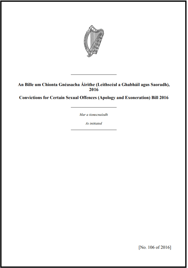 Labour Party then Senator Ged Nash introduces this Bill on 6th December 2016 to provide a State apology and to exonerate those men convicted under the anti-gay laws.